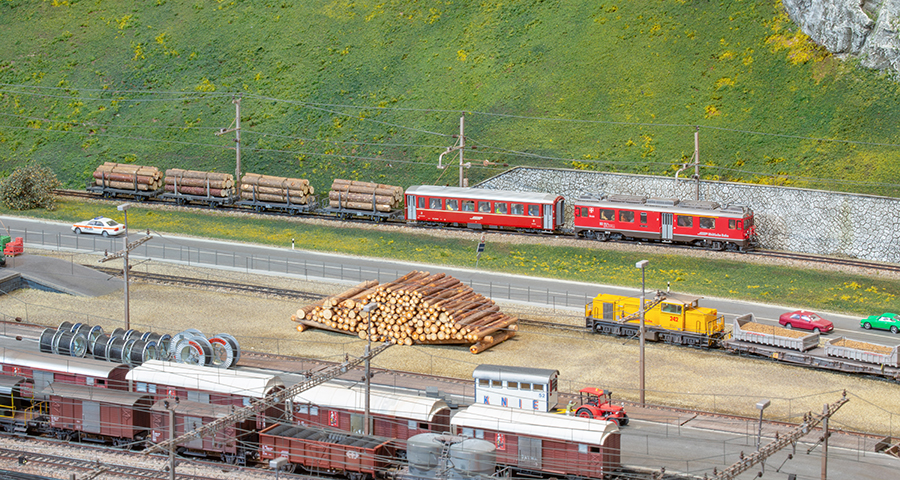 Personenzug St. Moritz – Tirano mit Güterlast Pontresina – Campocologno ABe 4/4 III, 1 MW, 47 t, Last: 16 Achsen, 84 t, 76 Pl., Vmax 60 km/h Bündner Rundholz wird auch heute noch nach Italien exportiert und gelangt immer noch zu mindestens einem Drittel per Bahn über den Bernina nach Campocologno