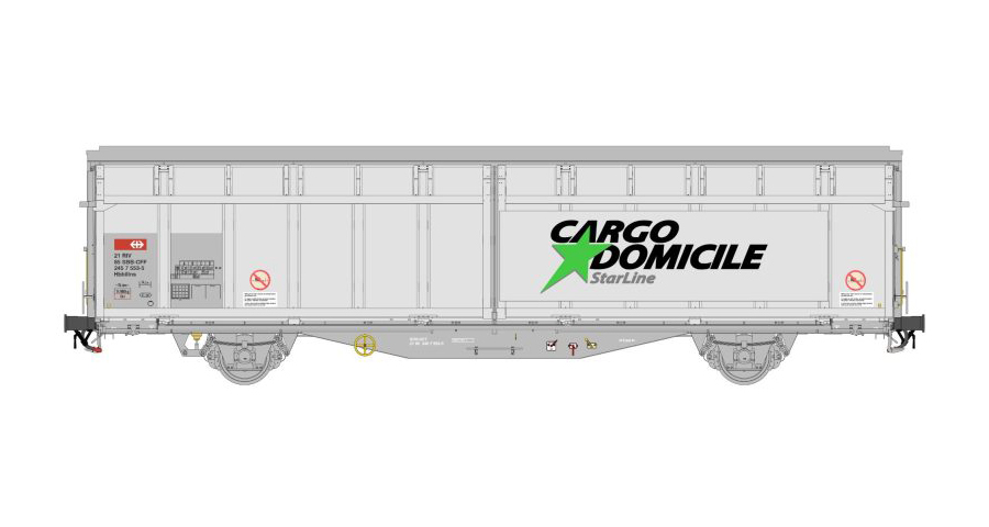 Hbbillns – Epoche IV / V Aufbau grau mit silbernen Türen, Fahrgestell grau Graue Felder mit SBB LogAufgesetzte Werbetafel „Cargo Domicile – StarLine“
